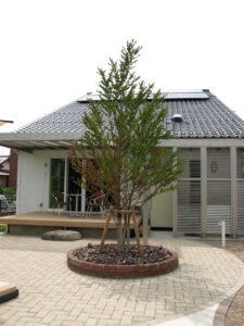 また、スギゴケは、生産する時は粘土質の土壌を使って育てています。土壌は3㎝程度です。購入したら、そのまま地面に貼って植え付けます。植えつけたらスコップの平らな部分で上から叩き、さらに、表面に細かい川砂をかけることで、不要な隙間を無くすことができます。